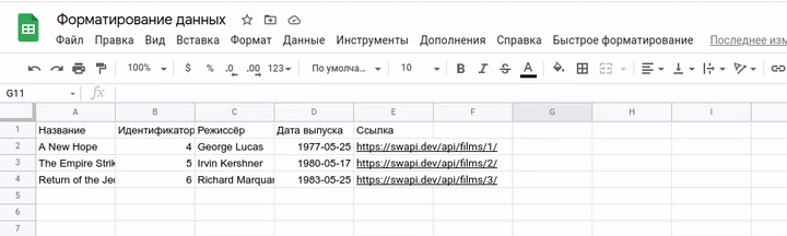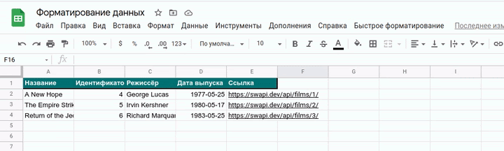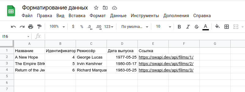 - Откройте Таблицу. Щелкните заголовок и измените его с "Копия Форматирование данных" на "Форматирование данных". Ваша Таблица, с некоторой базовой информацией о первых трех фильмах "Звездные войны" должна выглядеть так: