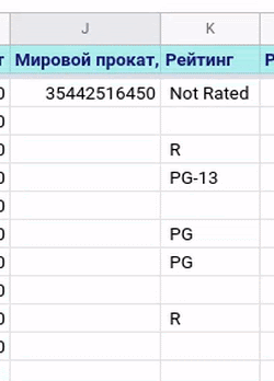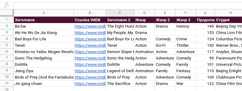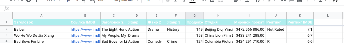 Копия примера Таблицы, которую вы можете использовать, будет размещена в папке Google Диска и называться "Копия Топ-10 самых кассовых фильмов (2020)".