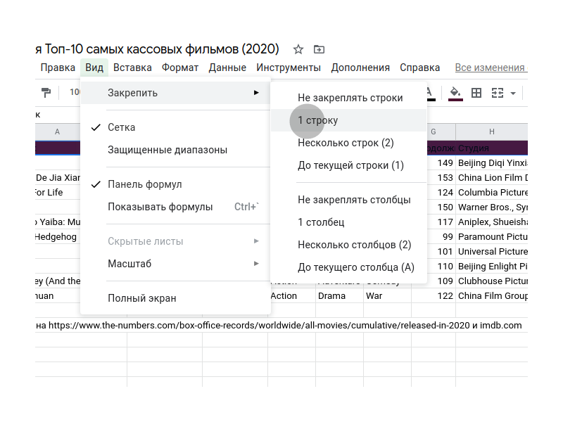 [Ctrl]+[B](или[Cmd]+[B]на Mac). - Выберите Меню > Вид > Закрепить > 1 строку, чтобы зафиксировать верхнюю строку.